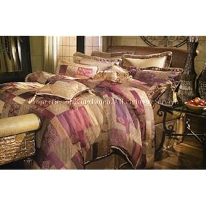 This lavish patchwork jacquard is abundantly rich in style, color and fabrication. The comforter, shams, and decorative pillows feature an impressive combination of paisley, damask, diamond, and lattice motifs woven with chenille and metallic yarns in a warm, spice-toned color palette. (deep burgundy, gold, sage, purple, actual colors darker than pictured). Decorative pillows with tassels and 2 Euro shams included. Matching curtains available.